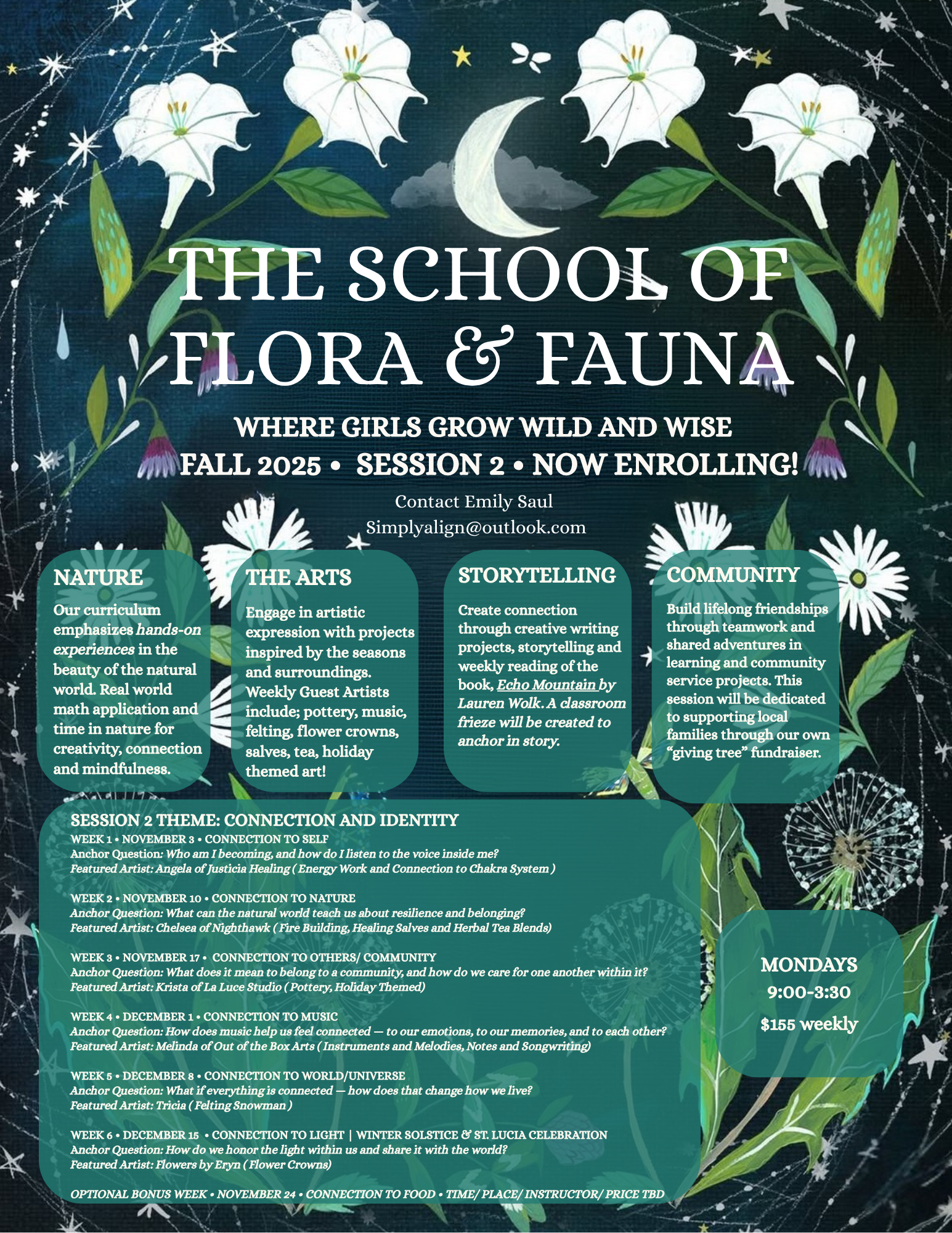 Connecting with the natural world through exploration, observation, and hands-on activities, fostering a deep appreciation for the environment. Real-world application of math skills and sacred geometry. Exploration of astrology and moon cycles throughout the seasons with weekly phenomenology walks and journaling, plus sit spots for reflection.